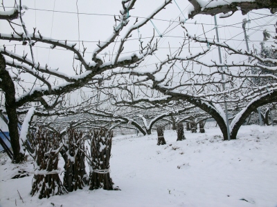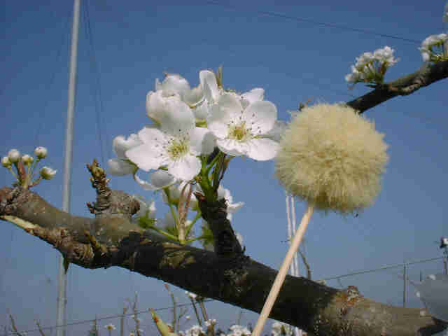 1つのつぼみから6〜7個ぐらいの花が咲きますが、3番目か4番目に咲いた花だけをねらって丁寧に受粉をします。ちょっと面倒ですが、大きくておいしい梨を作るための重要な技術です。