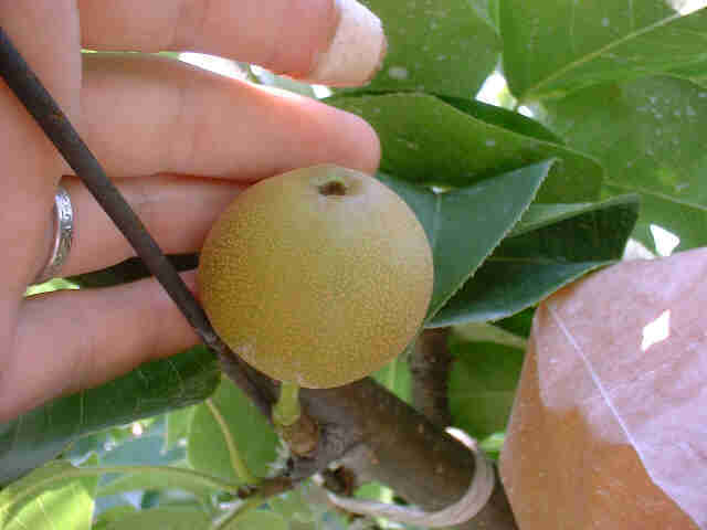 これからの重大な悩みのひとつはカラス対策です。ようやくここまで大きくなって、甘さがでてくるとカラスに狙いを付けられます。写真のような脅しをつけたりしますが、数日で慣れてしまうので手を変え品を替えての全面戦争です。 |